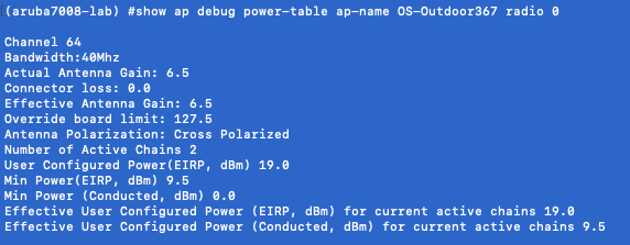 How can you validate this? If you have an Aruba system, you can find the conducted power of the radio by using the following command on your Aruba controller.