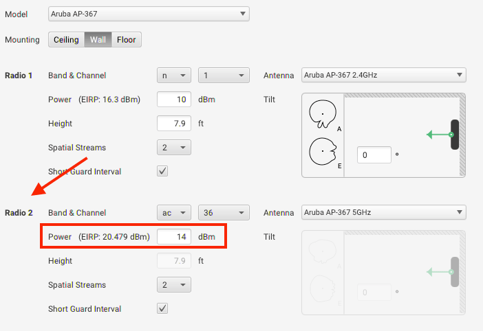 You can look at Radio 1 in the Ekahau AP Radio Settings image above and see that with a Tx power of 9.5 dBm (Ekahau rounds to 10 dBm), and an antenna gain of 6.5 dBi, Ekahau determines the EIRP to be 16.3 dBm when in reality it is 19 dBm.