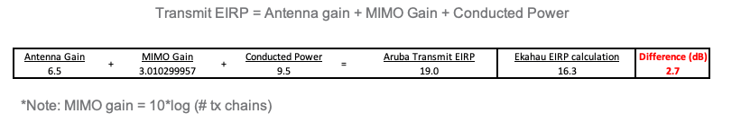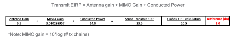 If you look at the following calculation, you will see that with a conducted (transmit) power of 14 dBm, the actual Aruba EIRP is 23.5 dBm (note: we’re assuming negligible loss with an integrated antenna system), yet the Ekahau calculation (shown in Radio 2 Ekahau example image above) is only 20.5 dBm. That’s a difference of 3 dB which means Ekahau is modeling half the power that is actually being output by the system!